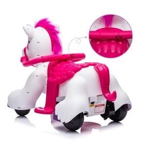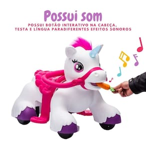 O mini unicórnio elétrico possui função frente e ré, acessórios para interagir e som, deixando a brincadeira ainda mais incrível. Com esse mini cavalinho elétrico, a diversão está garantida!