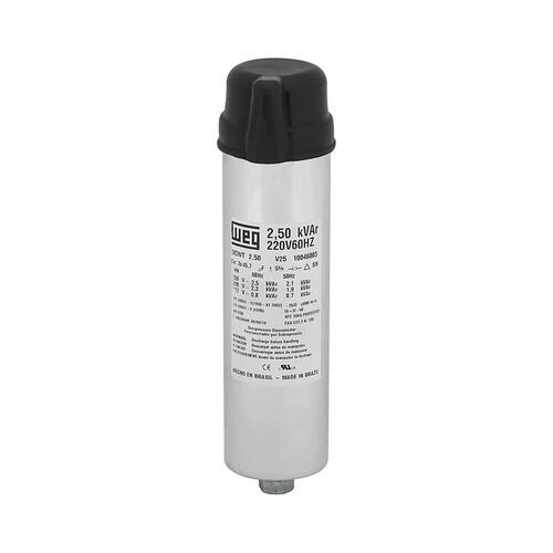 Desenvolvidos a base de filme de polipropileno metalizado auto-regenerativo, possui dispositivo interruptor de segurança contra sobre pressão interna e baixas perdas dielétricas. Resumo das características técnicas Potência reativa 1.5 kVAr Tensão nominal Ue 440V60Hz Frequência 60 Hz Tipo do terminal Parafuso Série D código: 10046016 Série D Capacitância ligação delta 6.9 F Tolerância da capacitância 5% Expectativa de vida 100.000 h Classe de temperatura -25/D Capacidade de curto circuito 10 kA Conexão da resistência de descarga Interno Material de preenchimento Resina poliuretana Máxima tensão 1,3 x Vn Grau de proteção IP50 Peso bruto 0,527 kg