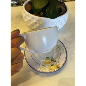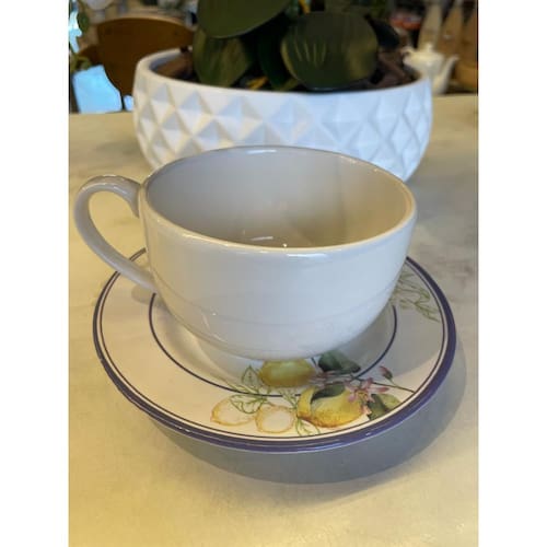 Pires: decorado com estampa de limões amarelos, folhas verdes e pequenos ramos floridos, trazendo um toque natural e alegre. O contorno é realçado com uma borda fina em tom azul arroxeado, que contrasta com o fundo branco.