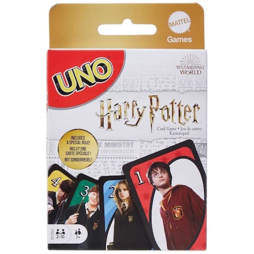 Descrição do produtoUno harry potterMais informaçõesMarca: mattelDescrição completaÉ o divertido e rápido jogo de cartas que você adora agora com personagens icônicos do mundo de harry potter junte-se a harry, hermione, ron, professor dumbledore e mais de seus personagens favoritos de hogwarts para uma noite de jogo uno. Os jogadores correm para se livrar de todas as suas cartas combinando uma carta em sua mão com a carta atual mostrada no topo do baralho. Marque pontos sendo o primeiro a se livrar de todas as cartas da sua mão. Cartas de ação especiais oferecem momentos de mudança de jogo, pois cada uma executa uma função para ajudá-lo a derrotar seus oponentes. Existe até uma carta especial de regras do chapéu seletor quando você joga esta carta, outro jogador de sua escolha deve continuar comprando cartas até encontrar uma carta da grifinória outras cartas de ação incluem skips, reverses, draw two e wild cards. Primeiro jogador ou time a 500 vitórias - e quando você tiver uma carta, não se esqueça de gritar uno um ótimo presente para fãs de harry potter, com 7 anos ou mais. Contém 112 cartões mais instruções. Para 2 a 10 jogadores com idade igual ou superior a 7 anos. As cores e decorações podem variar.Agradecemos a sua visitaHomologação Inmetro: CE-BRI/IQB 005923 53892/20-052