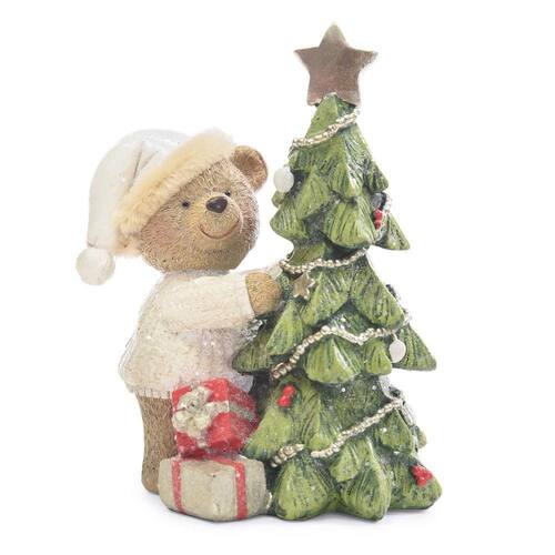 Ursinho Em Resina Marrom Com Blusa E Gorro Branco Abraçando Pinheiro 14Cm