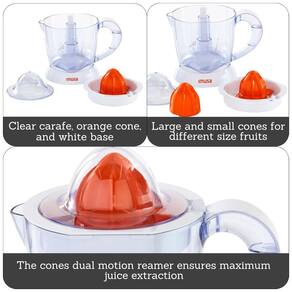 Desfrute de sucos naturais e espremidos na hora de seus cítricos favoritos todos os dias. Seu espremedor elétrico IMUSA pode ser para extrair o suco e as vitaminas de laranjas, tangerinas, toranjas, tangerinas, limões, limas e muito mais Com seus acessórios de cone intercambiáveis, há um cone de suco para acomodar frutas cítricas grandes e pequenas. A operação fácil de empurrar para baixo ativa o processo de suco, acompanhado de um alargador de movimento reverso para extração máxima de suco. Desta forma, você tem certeza de espremer até a última gota Equipado com uma tela de filtro ajustável, você poderá regular seu nível preferido de polpa. O jarro de 34 onças exibe marcações de medição para precisão e se destaca da base para que você possa levar para a mesa ou para a geladeira. Esteja você preparando um copo de suco de laranja, uma jarra de margarita ou seu ceviche ou marinada favorito, os sabores cítricos frescos definitivamente complementam qualquer receita