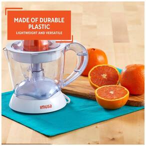 Espremedor de citrinos elétrico IMUSA com 40 Watts de potência, capacidade de 34 onças, inclui dois cones para diferentes frutas e jarra removível.