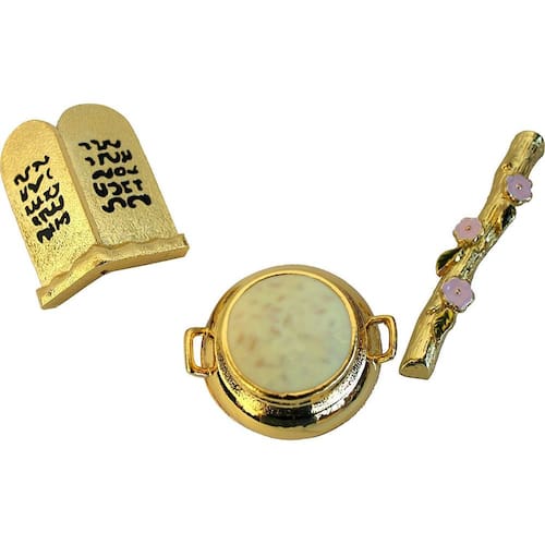 Pacote: 1. Vara de aarão que floresceu: 6,2cm 2. Vaso dourado com maná: 3,5 cm 3. Tabuas dos dez mandamentos: 4,2 cm