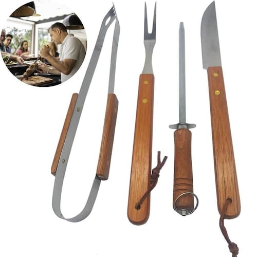 Cabo em madeira de alta qualidade Acabamento perfeito e anatômico Corte preciso com lâminas em aço inox Ideal para churrasqueiros Durabilidade e resistência Kit completo com 4 peças essenciais