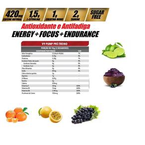 V9 pump pré treino suplemento creatina arginina d3 maracujá