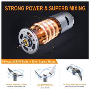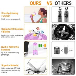 Lâminas atualizadas e velocidades mais altas e mais capacidade da bateria Lâminas SUS304 integradas de 6 peças em 3D e velocidade de rotação de até 22000 rpm, min.. O liquidificador portátil pode facilmente liquidificar qualquer coisa, incluindo pequenos cubos de gelo em pouco tempo. Construído em bateria de íon de lítio recarregável de 4000mAh 2 2000mAh, 20 25 xícaras de suco podem ser espremidas com carga total. Perfeito para batidos e batidos, sumos, shaker de proteínas, molhos para saladas, etc.