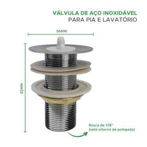 - Cor: Prata - Material: Aço Inox - Prático e moderno - Diâmetro de 56mm - Altura 82 mm - Rosca: 7/8 - Para cubas com furação entre 3 cm e 4,5 cm de diâmetro Marca: Não Informado