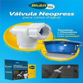 Válvula Transferidora/Alternadora de Pressão para Caixas D'água NEOPress Marca: Blukit Referência: 330601 Embalagem: Estojo A válvula NEO PRESS Blukit garante a utilização da maior pressão disponível no sistema. CARACTERÍSTICAS: - Material: Aço Inoxidável AISI 304, Plásticos de Engenharia e Elastômeros. - Temperatura Máxima: 45C. - Pressão Máxima de Trabalho: 40 m.c.a. - Pressão Mínima de Trabalho: 5 m.c.a. - Observação: Para instalação, o tubo extravasor (ladrão) deve ter o diâmetro mínimo de 50mm. - Produto testado e aprovado em laboratório próprio. - O produto é resistente à baixas e altas pressões. - Produto produzido 100% no Brasil. - Produto com 1 ano de garantia. - Este produto não é um pressurizador. FUNCIONAMENTO: SITUAÇÃO 1: PRESSÃO DA REDE PÚBLICA É MAIOR QUE A PRESSÃO INTERNA DA CAIXA D'ÁGUA: quando a pressão da rede pública for maior que a pressão da caixa d'água, automaticamente o êmbolo bloqueará a utilização de água da caixa e o fluxo de água será diretamente da rede para a saída d'água. SITUAÇÃO 2: AUSÊNCIA DE PRESSÃO DA REDE PÚBLICA (FALTA DE ÁGUA): quando houver falta d'água da rede pública, automaticamente, o êmbolo será deslocado para o outro lado. A água da rede pública será bloqueada, permitindo a utilização do volume da própria caixa d'água. O fluxo de água será através do volume de água da caixa, passando pela válvula e seguindo para saída d'água.