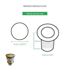 Válvula Click Dourada Fosca para Cuba de banheiro Esta válvula click traz a alta tecnologia sofisticação e qualidade, ideais para quem busca praticidade e eficiência. Com a função do escoamento da agua, possui um sistema rapido e simples com um clique, ela abre e fecha. Evita a entrada de insetos e do mau cheiro. Verifique as medidas do produto antes de efetuar a compra Especificações do produto: Válvula de escoamento Sistema Click Abre/Fecha ao apertar Para cubas de banheiro Não enferruja Evita o mau cheiro Evita a entrada de insetos Diâmetro 4,0 cm 1 ano contra defeito de fabricação Dimensões do produto nas fotos Informações Técnicas: marca: Reno material: Aço Inox formato: Redondo cor: Dourada Fosca diâmetro 4,0 cm ATENÇÃO: Não incluso cuba e torneira. Marca: Não Informado