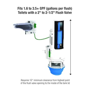 - Compatibilidade: Serve para vasos sanitários padrão de 2 peças de 2 peças GPF (galões por descarga) com 2 polegadas. válvula de descarga e requer folga mínima de 25,4 cm do ponto mais alto da abertura da válvula de descarga até o interior da tampa do tanque; Observação: NÃO SERVE PARA sanitários Mansfield e não é compatível