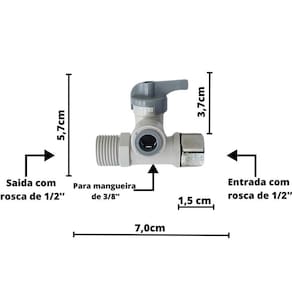 Composição: plástico; Cor: cinza; Conexão entrada rosca externa: 1/2 macho ; Conexão saída rosca interna: 1/2 fêmea ; Conexão lateral para mangueira: 3/8 mangueira grossa Forma de utilização: residencial e industrial;