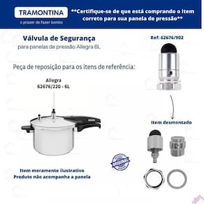 Nosso empenho é procurar o que há de mais atual e funcional no mundo culinário e para organização da sua casa, priorizando sempre a qualidade e a versatilidade dos produtos. Extremamente reforçado, garantido a segurança da panela . Modelos: 62676/220 Material: metal, baquelite Embalagem contém: 1 válvula de segurança tramontina allegra 6l item desmontado - antes de cozinhar, verifique seu equipamento; - não sobrecarregue sua panela; - mantenha sempre os cuidados necessários para o bom funcionamento; - limpe-a corretamente; - use sempre produtos de qualidade. Manutenção em dia= panela segura. Gostou Esse produto pode ser seu aguardamos sua compra Marca: Não Informado Ean: 7898749650890