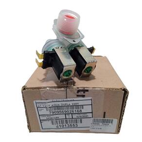 A Válvula de Entrada de Água Dupla 220v é a peça que controla a entrada da água na máquina! Ela é acionada sempre que o eletrodoméstico precisa, fazendo uma leve pressão e liberando o líquido pra passar, dando início ao ciclo de lavagem!