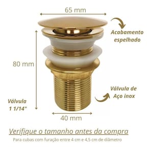 Válvula Click Dourada 1 1/4 Produto desenvolvido com SISTEMA CLICK, uma tecnologia que permite abrir e fechar o fluxo de água com apenas um clique.Seu corpo é em Aço Inox de alta qualidade e tampa de Liga Metálica de Cobre e Zinco para pias, cubas e lavatórios em áreas externas ou internas.Possui vedação de silicone e espessura mais grossa, reforçando ainda mais a vedação.Tamanho PADRÃO de MERCADO BRASILEIRO 1 1/4 - 4 cm - 40 mmFÁCIL instalar, só trocar a válvula antiga pelo atual modelo.Evita a entrada de insetos e mau cheiro. Ficha Técnica: Marca: ZRT Material: Aço Inox Dimensões: Diâmetro inferior 1 1/4 - 4 cm - 40 mm Tampa click: 6,5 cm de diâmetro Altura: 8 cm sem contar a tampa click Para cubas com furo entre 4 cm - 4,5 cm de diâmetro Para sifão universal Cor: Preto Fosco Peso: 0,174 Kg Garantia: 3 meses contra defeito de fábrica. Itens incluso: 1 Válvula click 1 1/4 Dourada Um produto com design sofisticado, moderno e prático que dá um acabamento mais funcional e bonito a sua casa.