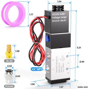 Características do produto: ?Tamanho compacto, fácil de montar e desmontar. ?O botão manual testa o status do produto quando ele é ligado. Dois orifícios de entrada de ar não podem ser utilizados ao mesmo tempo. Ao usar, você precisa bloquear um lado com um plugue. ?O corpo da válvula é feito de liga de alumínio e tem forte resistência à pressão, boa vedação, seguro e confiável de usar. ?O orifício interno é usinado por um processo especial, com baixa resistência ao atrito, baixa pressão de ar inicial e longa vida útil. ?Preste atenção à direção do fluxo de gás e à conexão correta ao instalar. Preste atenção à prova de poeira. Recomenda-se instalar um silenciador na porta de escape. A válvula solenoide de ar tem válvula solenoide de controle único com estrutura piloto interna, estrutura de coluna deslizante, boa vedação e responsiva. Especificações do produto: ?Modelo: 4V310-10; Tipo: 5 maneiras 2 posições. ? Entrada = Saída = 3/20.3 cm NPT Escape = 1/10.2 cm NPT; Valor CV: 0,78, Pressão: 25-116PSI. ?Voltagem: DC24V; Tipo de operação: Tipo de ação pilotado internamente. ? Número de posição e via: Duas posições, cinco vias. ? Diâmetro da porta da rosca fêmea: 10 mm / 0,375". Conteúdo da embalagem: 1 × 4V310-10 (válvula solenoide). 1 fita de teflon 3 × PC3/8-3/8 Silenciador pneumático de 6 mm - ?Nome do produto?Válvula solenoide de 5 vias com 2 posições (fio de saída) - ?Tensão? CC 24V ?Pressão de trabalho?25~116Psi - ?Princípio de funcionamento?A válvula permanece aberta quando a bobina é desenergizada - e fecha quando energizada. - ?SIze?Porta de saída: 3/8" NPT; Porta de entrada: 3/8" NPT; Porta de escape: 1/4" NPT. Fornecemos acessórios pneumáticos, que podem ser utilizados conectando diretamente tubos de ar de 3/8 ou 10 mm. - ?Resposta rápida?Cabeça piloto de válvula solenoide de alta qualidade, resposta sensível, velocidade de resposta 4 vezes por segundo, desempenho estável.