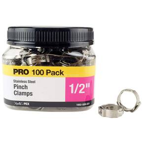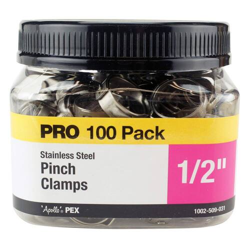 Pinça de aperto Apollo Valves PXPC12100JR, aço inoxidável - O pacote Pro inclui 100 braçadeiras de aço inoxidável em uma conveniente jarra revendável - Construída em aço inoxidável resistente à corrosão - Projetada para uso com conexões PEX para tubos e farpas (não incluídas) - As pinças são ideais para uso em espaços apertados - Requer uma ferramenta de pinça (vendida separadamente)