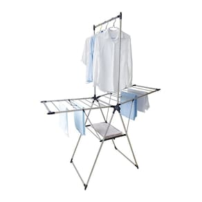 Este rack se estende e dobra facilmente para fácil armazenamento. É feito de aço inoxidável, material que o torna estável, resistente e capaz de suportar muitos quilos de roupa.