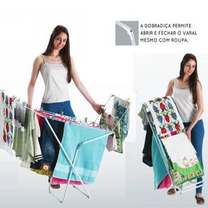 Este varal é ideal para atender as exigências dos condomínios de prédios onde o varal não pode exceder a altura do corrimão das sacadas. Ele é prático e funcional. A dobradiça permite abrir e fechar o varal mesmo com roupa. Facilita no manuseio e transporte, na passagem pelas portas, corredores, sala, cozinha, etc. Os varais de roupa de chão são fáceis de montar e desmontar, o que os torna portáteis e ideais para quem precisa economizar espaço ou deseja secar roupas ao ar livre. Eles oferecem uma solução prática e econômica para a secagem de roupas, especialmente em climas ensolarados. Este varal possui trava de fechamento das abas, pode ser guardado facilmente e tem capacidade para estender 8,46 metros de roupa e suporta 16kg de peso.