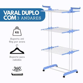 Principais Benefícios: Compacto e funcional – perfeito para áreas pequenas e lavanderias reduzidas 3 andares dobráveis – mais espaço para secar roupas sem ocupar o ambiente Sapateira integrada – ótimo para secar tênis, chinelos e sapatos 2 cabideiros laterais + abas retráteis – acomoda até 16 cabides Rodinhas giratórias 360° – fácil de mover mesmo com roupas molhadas Montagem sem ferramentas – fácil de montar, desmontar e guardar