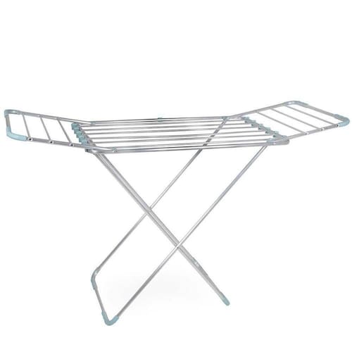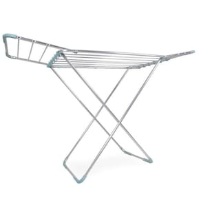 - Este modelo traz o tradicional varal de chão com abas equipado com ponteiras plásticas na cor azul;