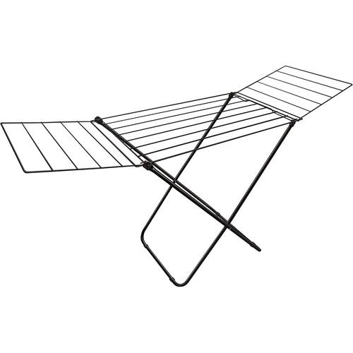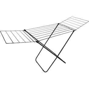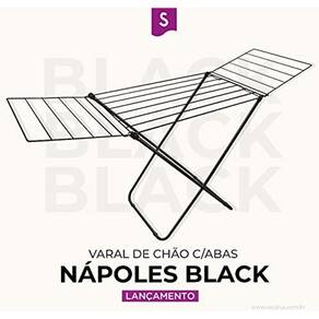 VARAL DE CHÃO NÁPOLES COM ABAS – AÇO – PRETOVaral de aço, com acabamento em plástico.Fechado, ocupa pouco espaço e de fácil manuseio.Ideal para viagens, apartamentos e pequenas lavanderias.Categorias: Varais de Chão Aço, Com abas, SecaDescriçãoCaracterísticas do ProdutoCapacidade de roupas úmidas: 11 kgEquivale: 10,20 mCor da estrutura: PretoCor do acabamento: PretoPortátil: SimAjuste de altura: NãoDobrável: SimAba: SimQuadro inferior: NãoVaretas do quadro: 8Varetas da aba: 2 abas com 5 varetas cadaContém: 1 unidade de varal de chão modelo NÁPOLES COM ABAS – AÇO.Precauções de uso: Evite acidentes. Mantenha o produto fora do alcance de crianças. Cuidado ao abrir e fechar o produto, pois pode gerar o esmagamento das mãos.Nota: As medidas do produto podem sofrer uma variação de tamanho de + ou – 2cm.Composição do ProdutoEstrutura do produto: Aço carbono pintado em pretoAcabamento plástico: Polietileno / PolipropilenoRebites: Aço zincadoDimensões do Produto(valores aproximados)Medidas do produto aberto até a aba: 0,83 x 1,37 x 0,46Medidas do produto fechado: 1,05 x 0,49 x 0,03