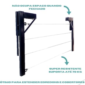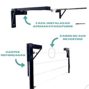 Varal De Parede Retrátil Super Reforçado O que acompanha com o varal: - 01 par de hastes dobráveis reforçadas de 50 cm. - 20 metros de cabo de aço revestido de 1,7 mm. - 06 buchas s10 com parafuso sextavado para concreto. - 02 abraçadeiras para cabo de aço Nosso varal é o mais reforçado do , não usamos cordas de nylon e sim cabos de aço revestidos Nosso produto é de altíssima qualidade, produzido em aço carbono na chapa 1,2 mm com pintura automotiva para que nossos varais tenha maior resistência contra ferrugens. Com um designe moderno e de fácil instalação, proporcionado a sua casa um aspecto muito mais bonito. Indicado para lugares apertados como corredor, lavanderia, apartamentos e etc, o varal dobrável reforçado tem como sua maior característica o ganho de espaço quando não utilizado, deixando ele com apenas 5 cm da parede/muro. Com cabo de aço revestido evitando a quebra de cordas para dar mais segurança as suas roupas. O material de fabricação é de alta qualidade. Marca: Não Informado