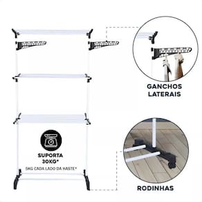 SUPORTE DE 30kg: Suporta até 30kg de roupas, podendo ser utilizado até para roupas de cama.