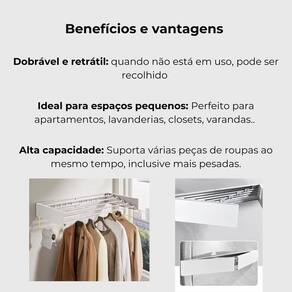 7894100135310varal Retrátil de Parede 60cm, Economia de Espaço com Estilo Transforme qualquer cantinho da sua casa em um espaço funcional e organizado com o nosso varal retrátil dobrável de parede de 60cm Com um design moderno, minimalista e extremamente prático, ele é a solução ideal para quem precisa de versatilidade sem abrir mão da elegância. Pronto para surpreender: Com apenas 4cm de profundidade quando fechado, passa quase despercebido no ambiente. Aberto, oferece 60cm de estrutura firme e resistente para secar roupas, pendurar toalhas, organizar sapatos ou até brinquedos Ideal para: Lavanderias pequenas Quartos e closets Banheiros Varandas Quartos infantis como porta-brinquedos Fácil de instalar, acompanha suporte para fixação na parede. Características Técnicas: Material: Aço com Pintura eletrostática Tamanho aberto: 60cm largura x 40cm profundidade x 9,5cm altura Tamanho fechado: Apenas 4cm de profundidade Dobrável e retrátil: Ganhe espaço com praticidade Cores disponíveis: Branco Peso aproximado: Leve e fácil de manusear Instalação: Fixação direta na parede com parafusos inclusos Este varal também pode ser como suporte para roupas passadas, organizador de roupas do dia a dia ou até mesmo como expositor de produtos leves em lojas físicas Marca: Não Informado Ean: 7894100135310