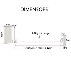 Possui cordão de aço inox de até 4 metros e 20 centímetros e suporta até 20kg de roupas.