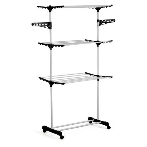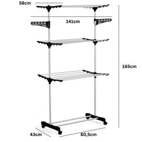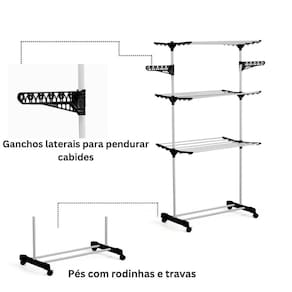 Varal para roupas de chão dobrável vertical 3 andares elevare Possui 3 andares e abas laterais ajustáveis maximizando a capacidade de secagem sem ocupar muito espaço. Rodinhas giratórias com sistema de travamento. Abas laterais suportam até 14 cabides, mantendo suas roupas organizadas e sem amassados. Montagem simples, durabilidade excepcional e design inovador. Design inteligente que se adapta, organiza e embeleza a sua vida. A solução ideal para otimizar espaços com sua funcionalidade vertical e seus pés com rodinhas facilitando o deslocamento com ou sem roupas penduradas. Pensou em durabilidade e qualidade você encontra nesse varal com estrutura reforçada em ferro e o acabamento de pintura eletrostática conferem uma resistência superior aos demais encontrados no mercado. Vale a pena conferir Especificações Técnicas Dimensões: Altura: 165 cm Comprimento: 80 cm Largura: 57 cm Peso: 4 kg Capacidade de Carga: Até 30 kg Materiais: Estrutura: Aço inoxidável. Prateleiras: Plástico ABS reforçado. Marca: Não Informado