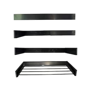 Material: Alumínio com pintura eletrostática preta – resistente à umidade, não enferruja e não descasca. Medida: 90cm x 45cm x 9,5cm (Largura x Profundidade x Altura) Quantidade de varetas: 5 Capacidade: Suporta 2 kg por vareta, totalizando 10 kg. Instalação: Acompanha buchas e parafusos para fixação na parede. Garantia: 3 meses