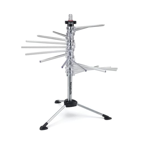 Uso: Abrir os pés em formato de pá e apoiar as bases emborrachadas sobre superfície lisa. Em seguida disponibilizar as varetas em circulo. A vareta encaixada na coluna central, serve para retirar a massa recém-cortada e pendurá-la nas varetas de secagem. Limpeza: o varal deve ser limpo com um pano úmido e pincel. Não usar objetos metálicos. Não molhar.
