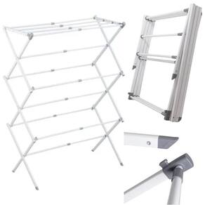 Composição: Ferro e PP Polipropileno Peso Aproximado: 2 kg Dimensões Montado: Altura: 103 cm Comprimento: 37 cm Largura: 40 cm Dimensões Fechado: 43 cm x 51 cm Cor: Branco e Cinza Capacidade: Suporta até 10 kg de roupas úmidas Varetas: 11 varetas extensíveis