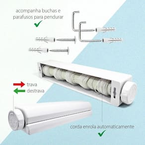 Transforme a tarefa de secar roupas em algo prático e eficiente com o varal automático 5 cordas retrátil de parede. Este produto oferece cinco cordas retráteis e um mecanismo de recolhimento automático, perfeito para quem busca praticidade, organização e sofisticação. Acompanha 6 ganchos, perfeito para pendurar toalhas, escovas, esponjas, o que for necessário. E o varal pode ser utilizado com ou sem os ganchos, de acordo com a sua necessidade. Feito com materiais resistentes e duráveis, este varal retrátil de parede é a escolha ideal para quem quer economizar espaço e tempo na hora de cuidar da roupa. O Varal possui um trava para evitar que feche automaticamente. Após, puxar o compartimento com as cordas, empurre a trava localizada na lateral do varal retrátil. O varal pode ser esticado até 3 metros e 75 centímetros. Característica: Varal Retrátil Compacto Economiza Espaço Fechamento Automático Fácil Instalação Trava Material: Polipropileno e Nylon Cor: Branco Peso Suportado: aproximadamente 3 Quilos em cada corda Dimensões Aproximadas: Comprimento do Varal: 37cm Largura: 6cm Comprimento da corda varal esticado: 3 metros e 75 centímetros Espaço entre as cordas: 6 centímetros Conteúdo da Embalagem: 1 Varal Retrátil 6 Ganchos 1 Kit de Instalação 3 Meses de Contra Defeito de Fabricação Marca: Não Informado