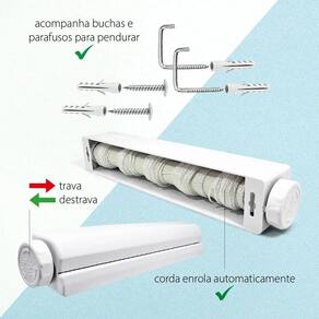 Transforme a tarefa de secar roupas em algo prático e eficiente com o varal automático 5 cordas retrátil de parede. Este produto oferece cinco cordas retráteis e um mecanismo de recolhimento automático, perfeito para quem busca praticidade, organização e sofisticação. Acompanha 6 ganchos, perfeito para pendurar toalhas, escovas, esponjas, o que for necessário. E o varal pode ser utilizado com ou sem os ganchos, de acordo com a sua necessidade. Feito com materiais resistentes e duráveis, este varal retrátil de parede é a escolha ideal para quem quer economizar espaço e tempo na hora de cuidar da roupa. O Varal possui um trava para evitar que feche automaticamente. Após, puxar o compartimento com as cordas, empurre a trava localizada na lateral do varal retrátil. O varal pode ser esticado até 3 metros e 75 centímetros. Característica: Varal Retrátil Compacto Economiza Espaço Fechamento Automático Fácil Instalação Trava Material: Polipropileno e Nylon Cor: Branco Peso Suportado: aproximadamente 3 Quilos em cada corda Dimensões Aproximadas: Comprimento do Varal: 37cm Largura: 6cm Comprimento da corda varal esticado: 3 metros e 75 centímetros Espaço entre as cordas: 6 centímetros Conteúdo da Embalagem: 1 Varal Retrátil 6 Ganchos 1 Kit de Instalação 3 Meses de Contra Defeito de Fabricação Marca: Não Informado Ean: 7890185137423