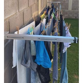 Varal retrátil de parede utilizado para estender roupas. Quando não esta em uso pode ser levantado liberando espaço no ambiente.