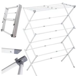Composição: Ferro e PP Polipropileno Peso Aproximado: 2 kg Dimensões Montado: Altura: 103 cm Comprimento: 37 cm Largura: 40 cm Dimensões Fechado: 43 cm x 51 cm Cor: Branco e Cinza Capacidade: Suporta até 10 kg de roupas úmidas Varetas: 11 varetas extensíveis