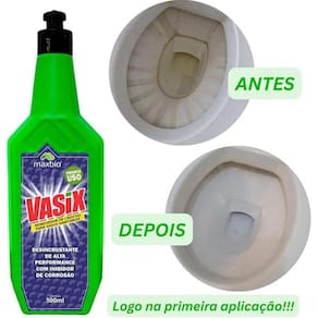 Modo de usar: produto pronto para uso Remover a água excedente no fundo do vaso sanitário; Aplicar de maneira uniforme o vasix; importante cobrir toda a superfície para que haja uma ação química eficiente; O produto tem uma viscosidade específica para permanecer em contato com as superfícies internas dos vasos sanitários; Deixar agir por 5 a 10 min; Reaplicar outra camada e esfregar com escova, esponja ou fibra branca / azul; Enxaguar com água em abundância.
