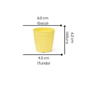 Vaso Aquarela Mini (0,20L) Amarelo NUTRIPLAN Descrição * Super leve e resistente, o vasinho colorido para plantas é fabricado em material plástico. * Ao utilizar o pratinho na parte superior o vaso se transforma em um lindo pote. * Vem com a marcação para facilitar os furos (não vem furado para que você possa usar como cachepô ou pote). * Em lindos tons, clarinhos, ideais para combinar com as mais diversas flores. Características * Altura: 6,2 cm * Largura boca: 6,0 cm * Largura do fundo: 4,5 cm * Cor: Amarelo Claro * Material: Plástico * Ref: 6101801-37