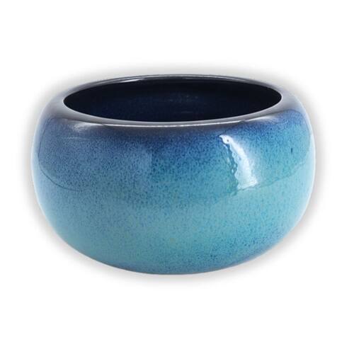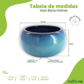 Característica *Material: Cerâmica Esmaltada * Cor: Azul com Preto * Altura: 8,5 cm * Diâmetro: 17,5 cm * Boca: 13cm * Largura total: 17,5 * Base: 14,5 * Furo de drenagem: Sim * Acabamento: Esmaltado * Produção: Artesanal