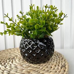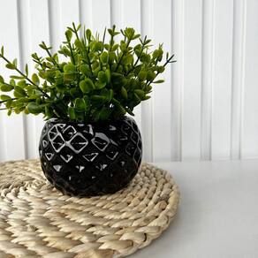 Decoração enfeite sala rack estante vaso cachepot preto de cerâmica com textura gométrica trabalhado 3D com arranjo planta artificial.