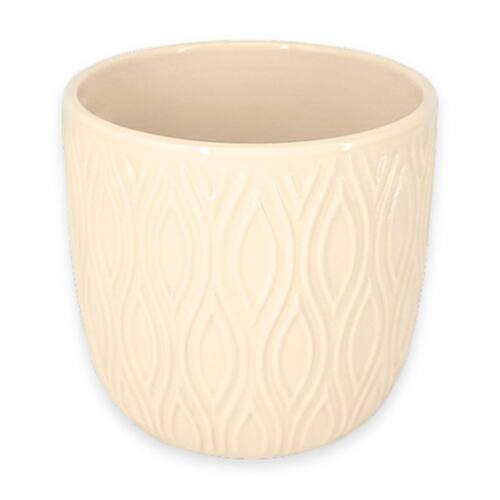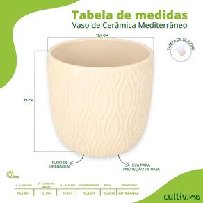 Característica * Tipo: Vaso de cerâmica esmaltado * Modelo: Mediterrâneo (12) * Cor: Off White * Altura: 12 cm * Largura superior (boca): 13,5 cm * Largura da base: 12 cm * Material: Cerâmica artesanal esmaltada * Acabamento: Brilhante com textura mediterrânea * Furo de drenagem: Sim * EVA protetor de base: Sim * Tampa para furo de base: Sim * Produção: Artesanal * Indicado para: Plantas naturais e artificiais; decoração interna e externa