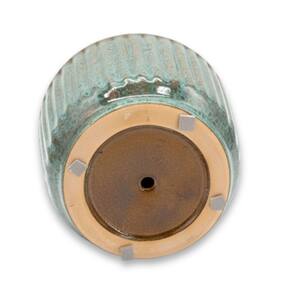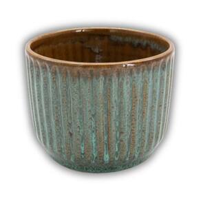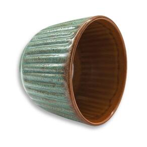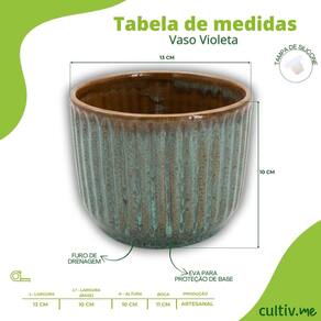 Característica *Material: Cerâmica Esmaltada * Cor: Verde Caramelo * Altura: 10 cm * Diâmetro superior (boca): 11 cm * Largura total: 13 cm * Base: 10 cm * Furo de drenagem: Sim, com tampa de silicone * Acabamento: Brilho * Produção: Artesanal * Indicado para Pote 11