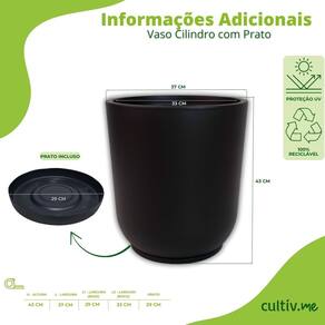 Descrição * O Vaso Cilindro com Prato OVASO reinventa o design clássico com proporções refinadas, ideal para quem busca elegância e funcionalidade em um só produto. * Seu acabamento jateado fosco confere um toque sofisticado e elegante, combinando facilmente com qualquer ambiente. * A cor carvão traz neutralidade e requinte, valorizando o verde das plantas e compondo ambientes contemporâneos. * Acompanha prato de encaixe perfeito, garantindo praticidade e evitando o acúmulo de água. * Produzido com material 100% reciclável e proteção UV, é resistente às variações climáticas, podendo ser utilizado em áreas internas e externas. * Ideal para salas, varandas, jardins e áreas gourmet, trazendo harmonia e estilo à decoração.