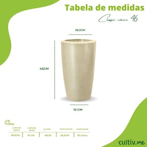 Vaso Classic Cônico 46 (18L) Areia NUTRIPLAN Descrição * As paredes lisas e o design atemporal do vaso Classic garantem um toque de classe a qualquer ambiente. * Deslumbrantes cores marmorizadas para complementar sua decoração com estilo. * Os vasos da linha Classic são peças que elevam o charme das suas plantas, conferindo-lhes uma aura de beleza e sofisticação. * Os vasos Classic Cônico são a escolha perfeita para criar composições memoráveis e elegantes. Caracteristicas * Tamanho: N-46 * Altura: 45 cm * Largura (boca): 26,5 cm * Largura (fundo): 19 cm * Capacidade: 18 Litros * Cor: Areia * Formato: Cônico * Material: Polietileno * Prato não incluso Informações/Dicas/Usos * A cor do vaso à venda é Areia. * Quaisquer outras cores, pratos, suportes, acessórios e dimensões mostrados nas imagens são apenas ilustrativos. Nós da CULTIV.ME trabalhamos desde 2013 para trazer os melhores produtos ao alcance de todos CULTIV.ME o verde que faltava!