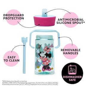 Vaso con popote emergente para niños pequeños The First Years Disney Minnie Mouse - Botella de agua para niños apta para lavavajillas con pico de silicona - Vasos de transición para niños - 420 mL - A partir de 12 meses - Pop para beber: Este vaso para niños pequeños tiene un popote que permanece guardado hasta que es hora de beber, ¡solo presiona, emerge y bebe! Además, el pico de silicona ofrece mayor tranquilidad. - Protección DropGuard: El borde alrededor de la tapa ayuda a proteger la botella de daños en caídas o golpes (niños, ¡los estamos mirando). - Ideal para viajes: Cada vaso con popote emergente incluye asas que facilitan que las manitas pequeñas lo sostengan, y se pueden quitar fácilmente cuando ya no se necesitan, siendo perfecto también para niños mayores. - Fácil de limpiar: El vaso de transición con popote Minnie Mouse es apto para lavavajillas y el botón cubierto pop-to-sip evita que las manos pegajosas de los niños metan suciedad en las ranuras. - Vasos con popote Disney para niños: Haz que beber sus bebidas favoritas sea divertido con la ayuda de Minnie Mouse y un diseño sin BPA para niños a partir de 12 meses.