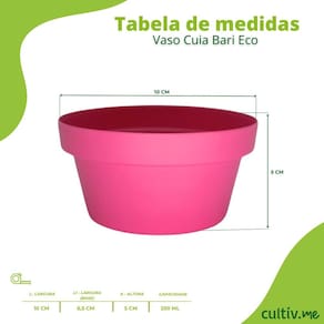 Vaso Cuia Bari Eco (10x5) Cor Rosa OKLA Descrição * Beleza, sustentabilidade e funcionalidade para suas plantas! * Possui pino para demarcação de reservatório de água e encaixe para medidor de nível (não incluso). * Produzido com 100% de material reciclado, alinhando tecnologia e respeito ao meio ambiente. * Perfeito para suculentas e plantas pequenas, criando um lar acolhedor e elegante para elas. * Transforme seu ambiente com um toque natural e sustentável!