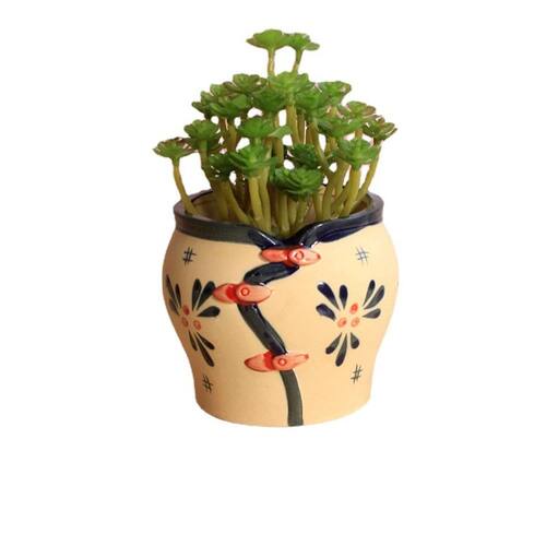 Material: cerâmica Tamanho: 10,3 x 10,3 x 10,3 cm Design floral pintado à mão — apresenta um motivo floral de desenho animado pintado à mão de inspiração coreana com cores vivas, dando a este vaso de cerâmica um estilo artístico animado. Material cerâmico durável — Feito de cerâmica espessa com textura rústica, garantindo robustez, respirabilidade e uso duradouro para diferentes tipos de plantas. Tamanho médio prático — Medindo 10,3 x 10,3 x 10,3 cm, este vaso oferece espaço adequado para plantas suculentas, cactos, ervas ou bonsai. Estilo rústico e decorativo — O acabamento exclusivo em cerâmica áspera com detalhes divertidos torna este vaso de flores funcional e visualmente atraente em qualquer ambiente. Vaso de plantio versátil — Ideal para desktops, parapeitos de janelas, varandas e jardins, aprimorando a decoração interna e externa com charme e criatividade.