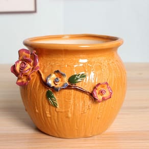 Material: cerâmica Tamanho: 15,8 x 15,8 x 14 cm Design de rosa em relevo 3D — apresenta um motivo de rosa aplicado à mão com pétalas e folhas coloridas, tornando este vaso de cerâmica elegante e atraente. Acabamento em laranja brilhante — O esmalte laranja brilhante com superfície texturizada confere ao vaso uma aparência viva e moderna, combinando arte com funcionalidade. Material cerâmico durável — Feito de cerâmica espessa e de alta qualidade para robustez, respirabilidade e uso duradouro em ambientes internos ou externos. Tamanho grande e espaçoso — Medindo 15,8 x 15,8 x 14 cm, este vaso oferece amplo espaço para suculentas, ervas, cactos ou pequenas plantas com flores. Vaso decorativo versátil — perfeito para desktops, varandas, jardins ou escritórios, aprimorando a decoração e servindo como um prático vaso de flores.